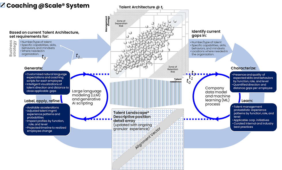 Refinements to the underlying talent architecture reveal an increasingly detailed description of talent positions and associated features, enabling correspondingly more precise guidance to talent. All of the collected data above is processed in applicable large language models directed to adjustments and enhancements likely to lead to positive change.